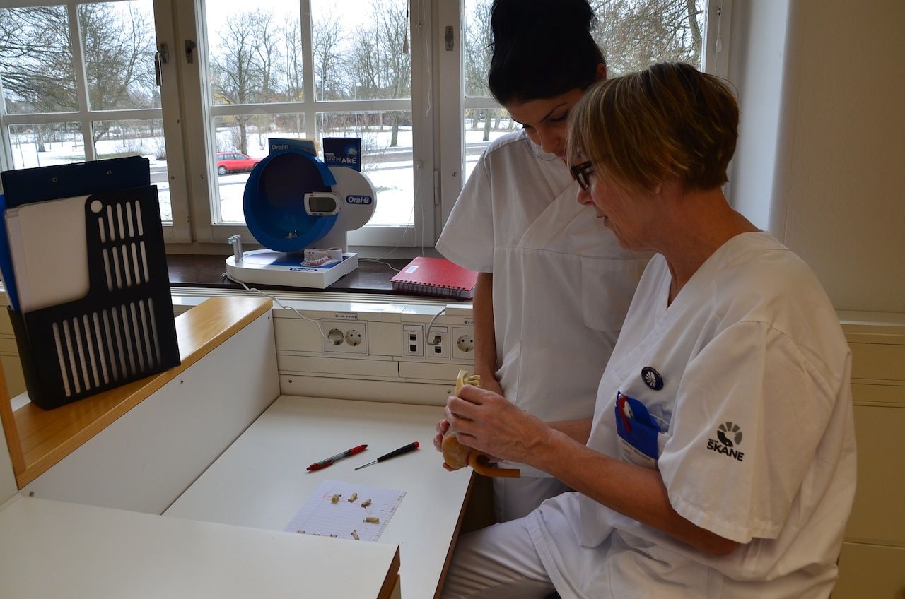 この大学は歯学部がなく、歯科衛生士科がある。皆さんもご存知かもしれないが、スウェーデンの歯科衛生士は麻酔やレントゲン撮影もすることができる。この日は学生実習があるというので同行させてもらった。